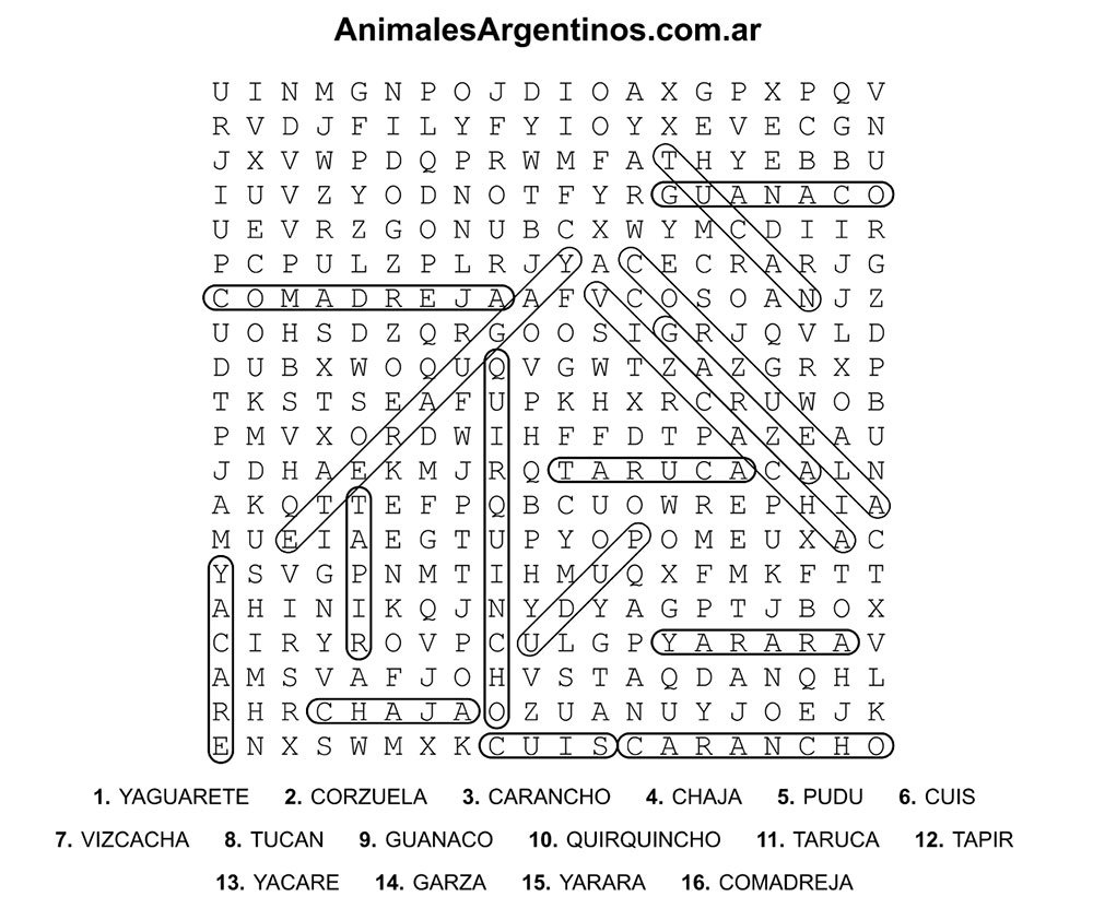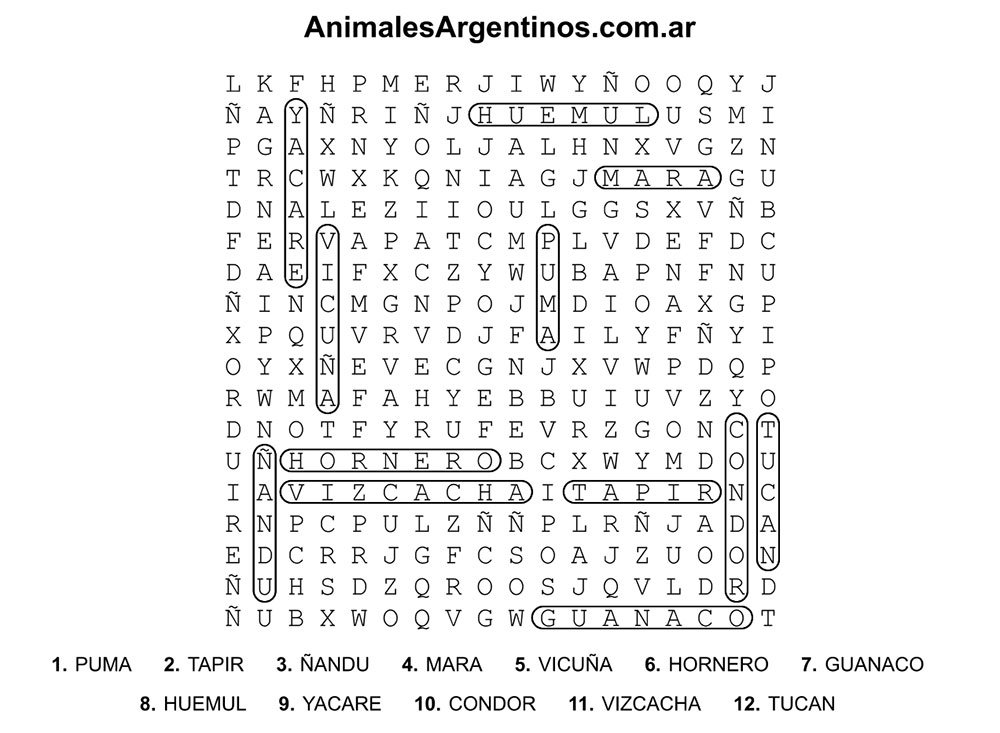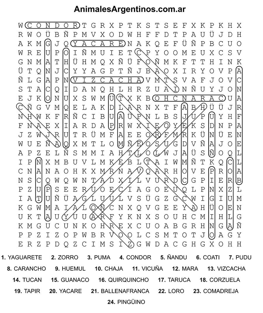 A continuación podés descargar distintas sopas de letras con nombres de animales como yaguareté, puma, guanaco, cóndor y muchos más.